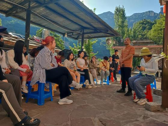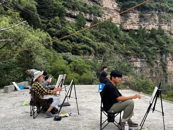 美术系 2022 级师生来到河南省林 州市太行山区石板岩镇的高家台村及其周边进行写生。以风景写生来提高学生的 审美能力、概括能力、创新能力,进而锤炼绘画语言,拓展创新思维。针对各专 业学生的实际情况,师生们以风景写生为训练手段,把自然的视觉形态转化成与 所表达的精神情感相契合的艺术语言。