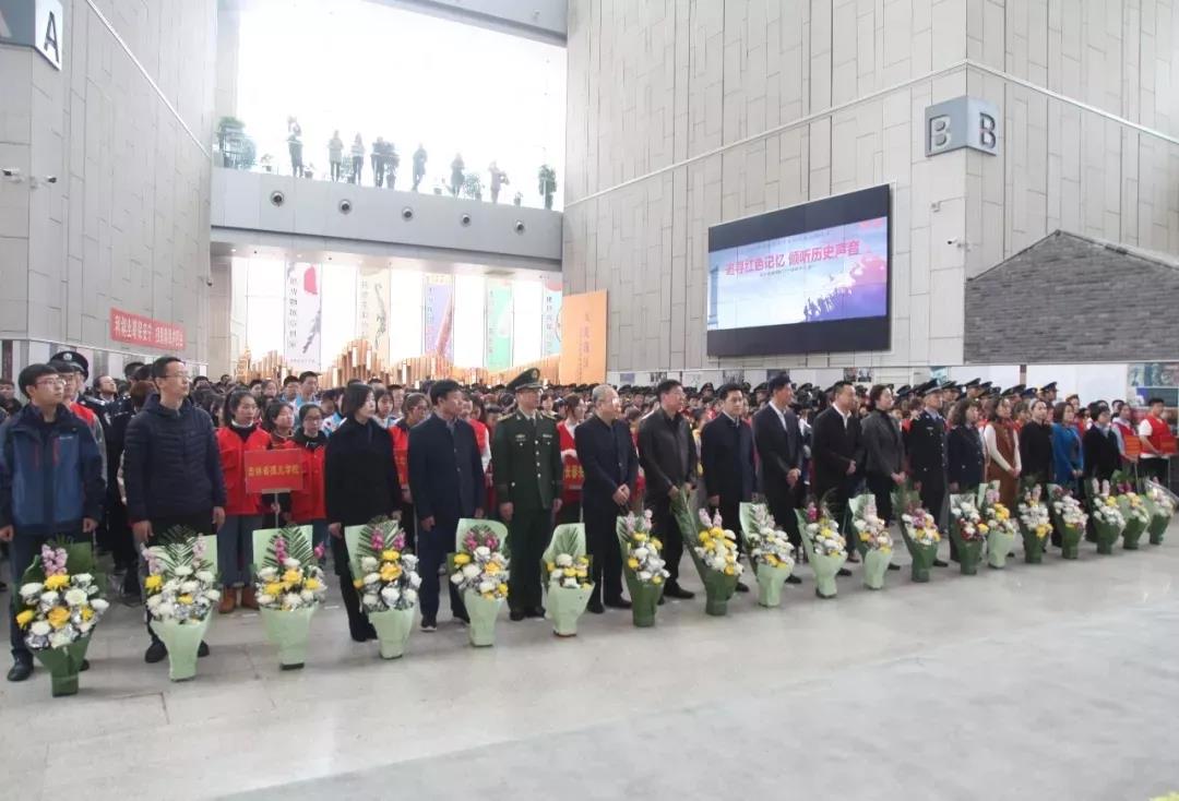 志愿者,手持黄色菊花,庄严肃穆,积聚在省博物院一层大厅,三名抗联将军和“小英雄”何畏的雕像引人注目,场内空军航空大学、武警吉林省总队机动支队、国家税务总局长春市宽城区税务局、东北师大附中明珠校区、长春市第52中学小学部、长春东光成人导航