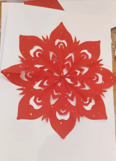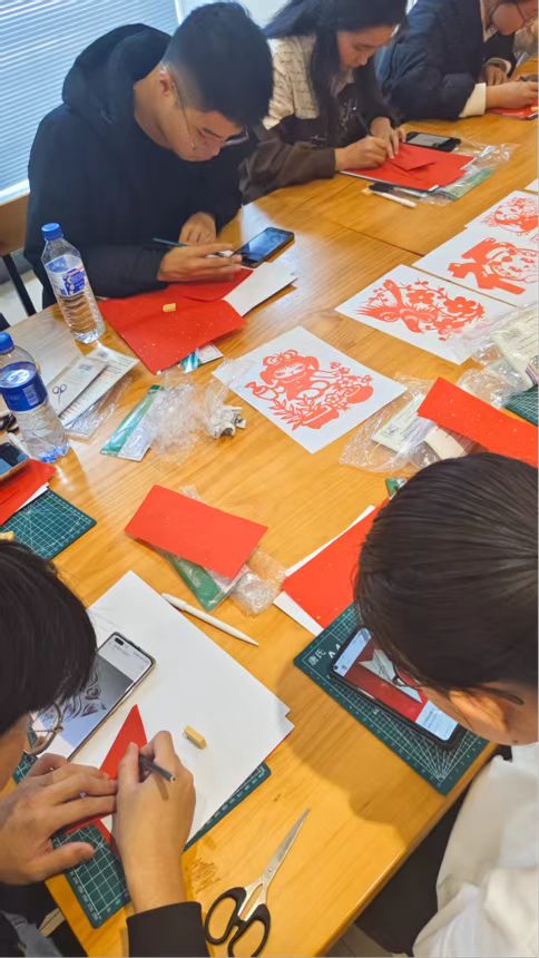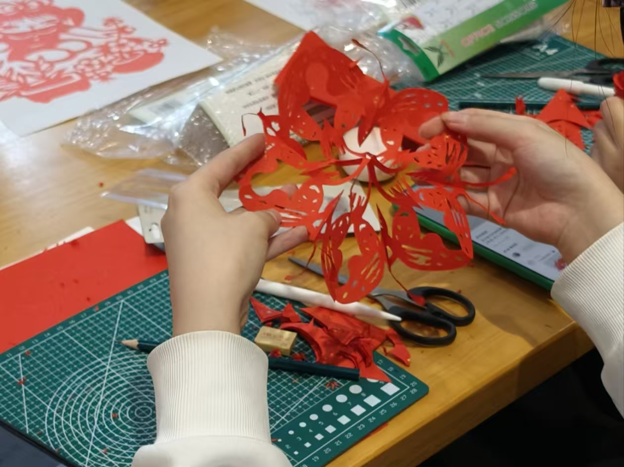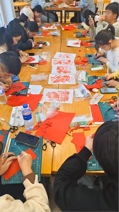 创作环节中,同学们发挥想象力与创造力。有的同学复刻经典吉祥纹样,让“福”字、祥云等传统图案在指尖绽放;有的同学融入校园元素,将教学楼、林荫道等熟悉的场景剪进窗花;还有人以友情、乡愁为主题,把对朋友的惦念、对家乡的思念,藏进红纸方寸的纹路中。现场氛围温馨而热烈,剪刀开合间,红纸翻飞,原本单调的纸张渐渐被赋予了温度与创意,一张张独具特色的剪纸作品应运而生。