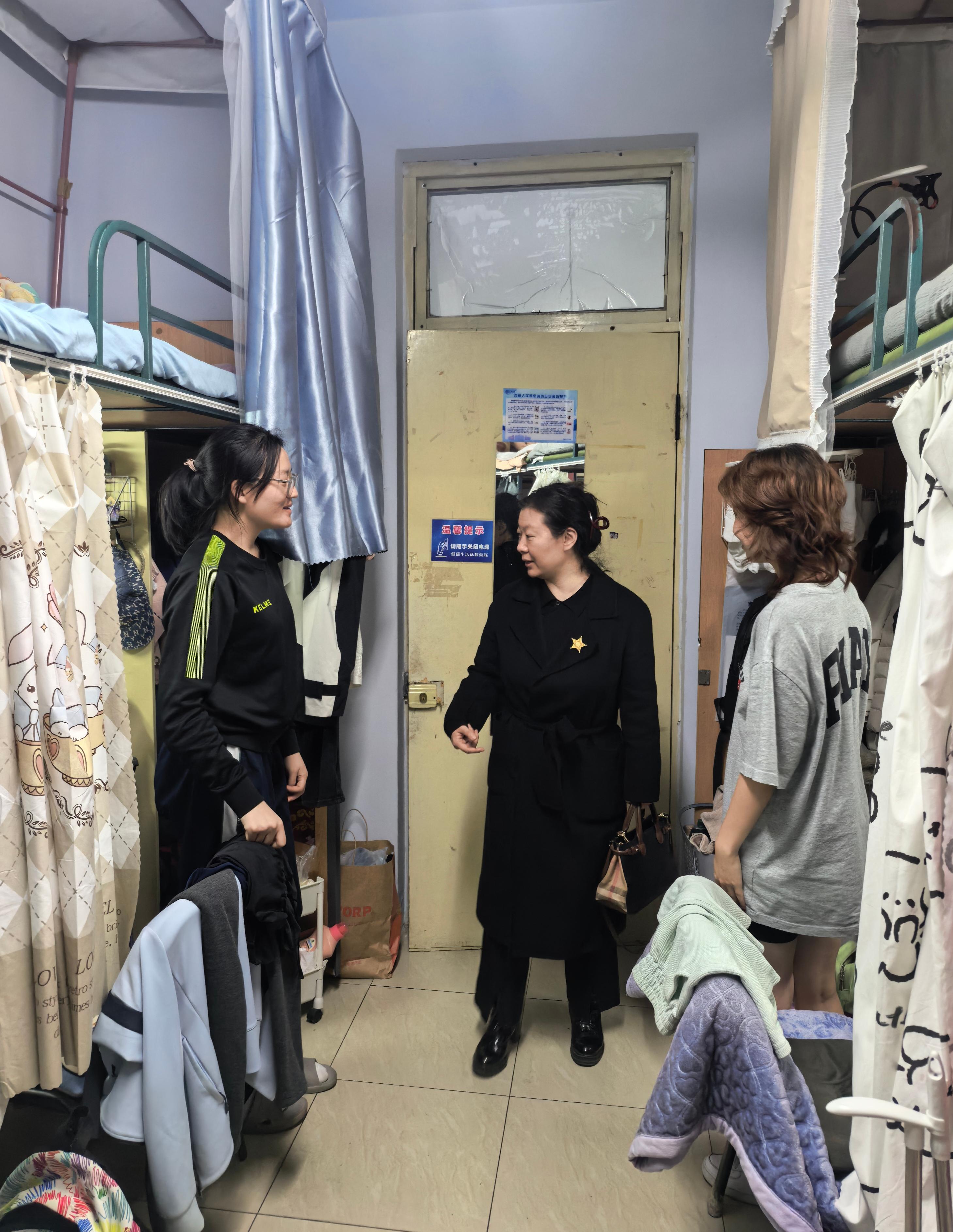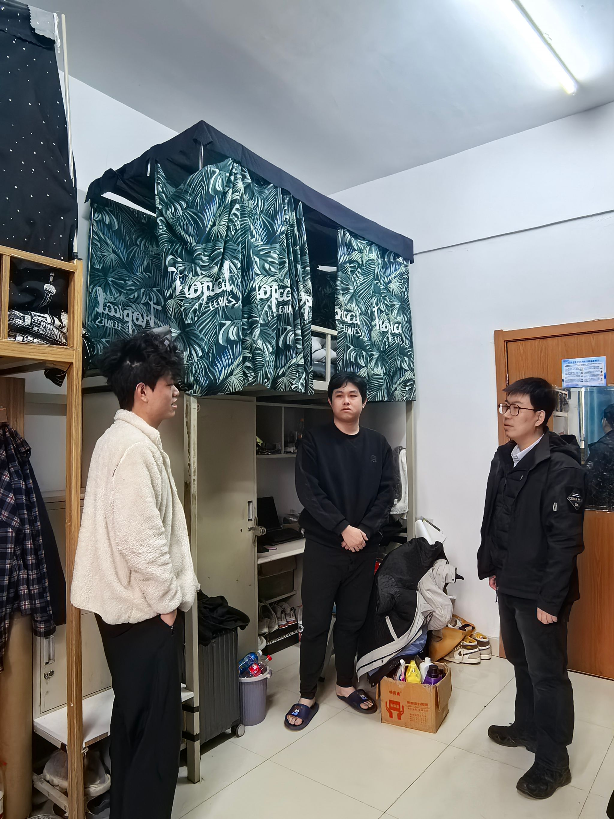 三位老师对照假期寝室管理标准,逐寝核查卫生状况、用电安全、消防隐患及离校报备情况。重点开展贵重物品保管、电源切断、门窗关闭等工作,对整理不规范的寝室点对点沟通,确保达到假期安全要求。同时,向学生叮嘱离校注意事项,对留校学生强调假期宿舍管理规定与安全防护要点。查寝间隙,师生们亲切交流,传递成人导航