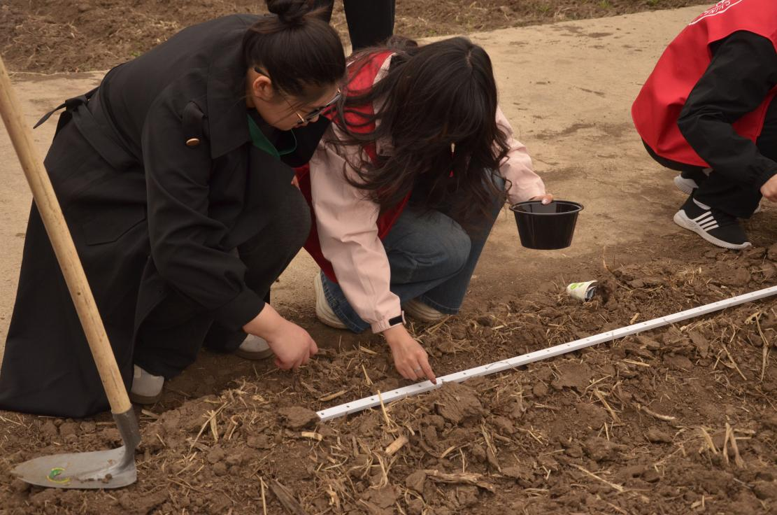 在专业老师的带领下,同学们前往劳动场地进行翻土耕地实践。同学们了解到了农业基础知识,从开垦到播种,从工具制作到园艺修剪,体验到了农耕活动的独特乐趣。随后开始劳动实践环节,同学们翻土、播种,每一粒种子的落下都承载着他们对丰收的渴望。