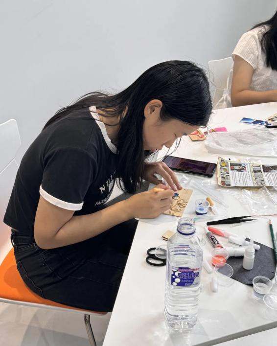 活动现场,同学们细心盘丝、点蓝、磨光,每一步都凝聚专注与创意。金丝蜿蜒,彩釉流转,原本冷硬的金属与矿物在指尖逐渐绽放出温润光泽。一枚枚独一无二的珐琅书签悄然成形,仿佛承载着秋日的诗意与青春的印记。